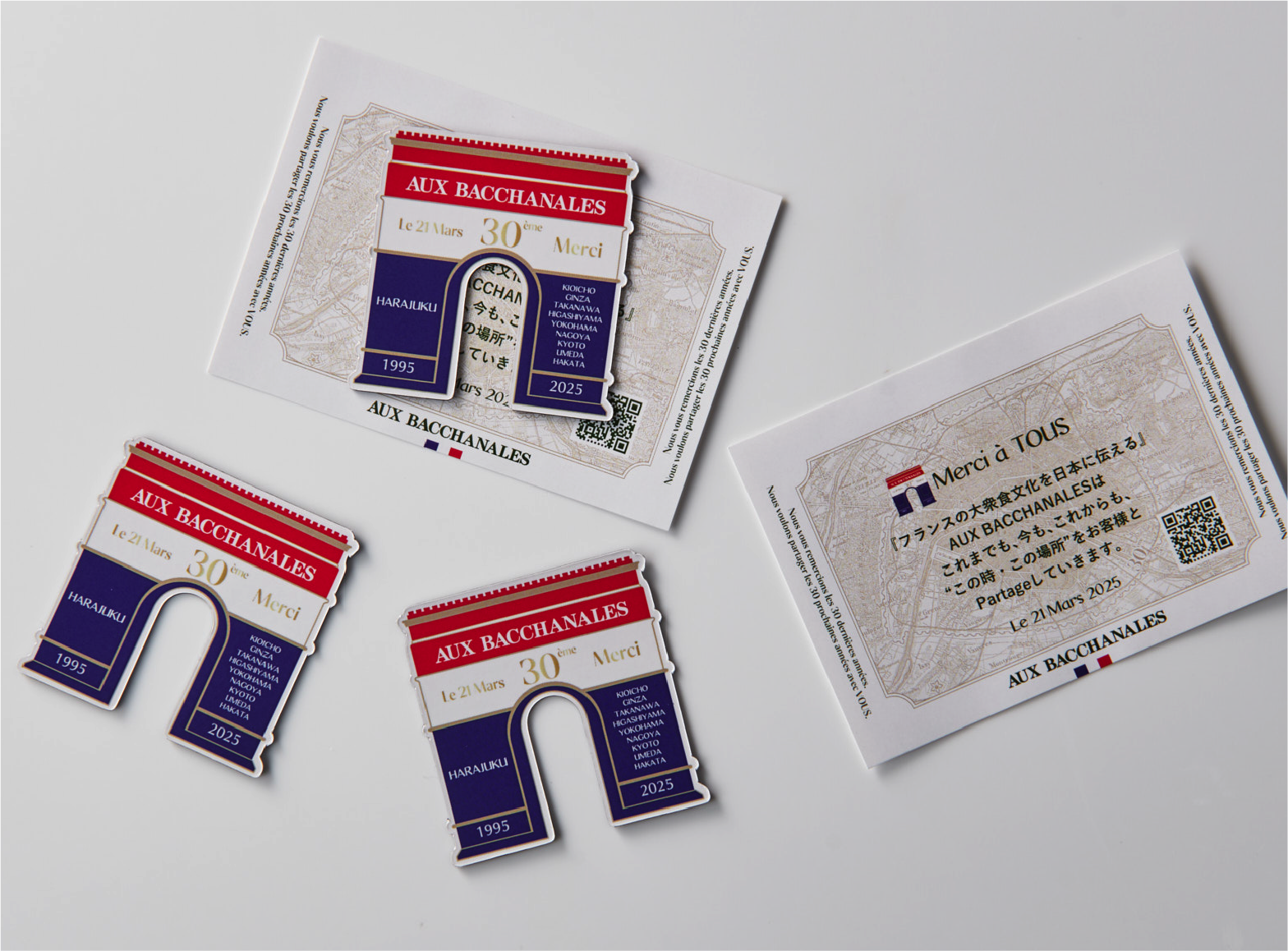 凱旋門をかたどった30周年記念のロゴマグネット。各店舗にて限定販売いたします。
