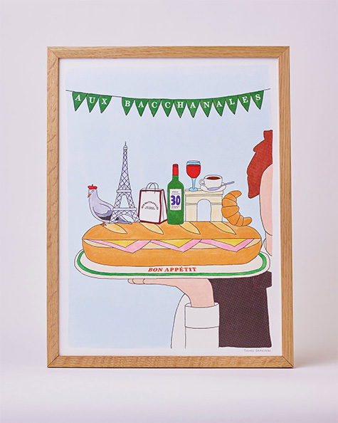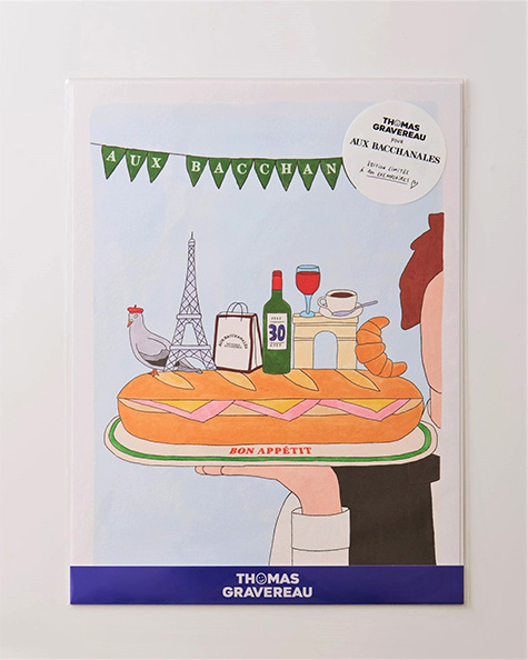 POPなタッチと今のフランスを描くイラストの世界で活躍するアーティスト Thomas Gravereau氏がAUX BACCHANALESを表現した作品「 Paris dans un trench(トレンチのパリ)」は、AUX BACCHANALESのアイコニックな商品やアイテムとフランスのシンボルをトレンチに詰め込み、エッセンシャルな存在である「ギャルソン」と共に表現され、パリやフランスとAUX BACCHANALESを象徴するそれぞれのエッセンスがThomas Gravereau氏の感性と作風によって、エスプリとウィットの効いたスタイルで違和感なく融合されています。